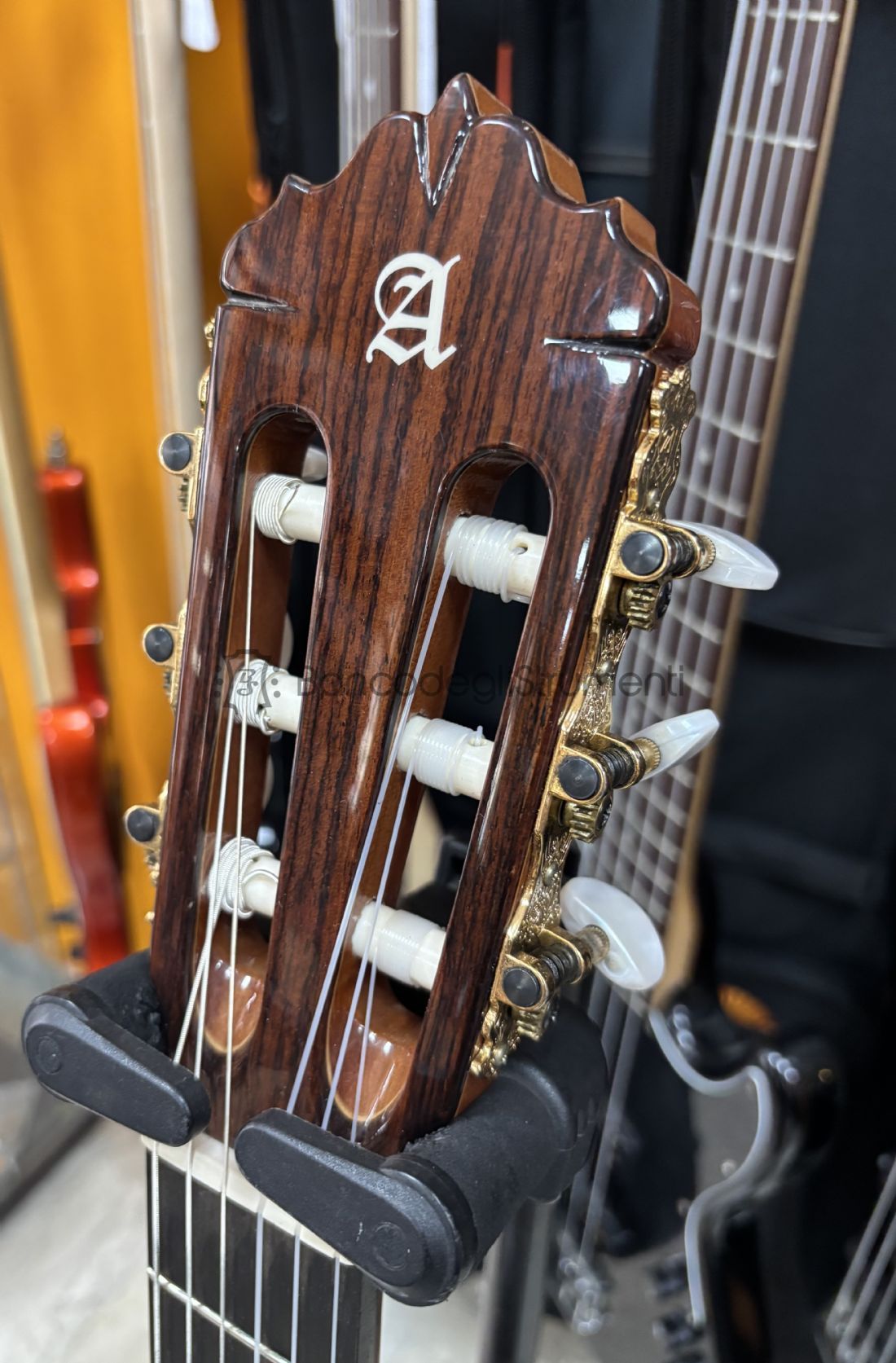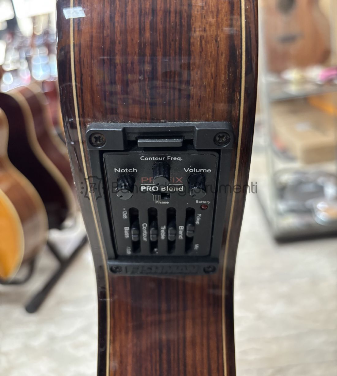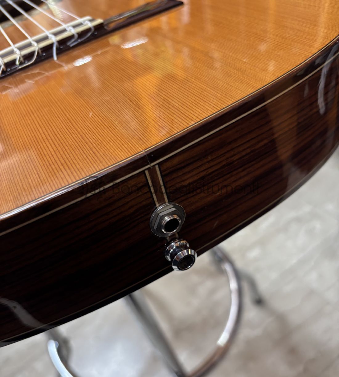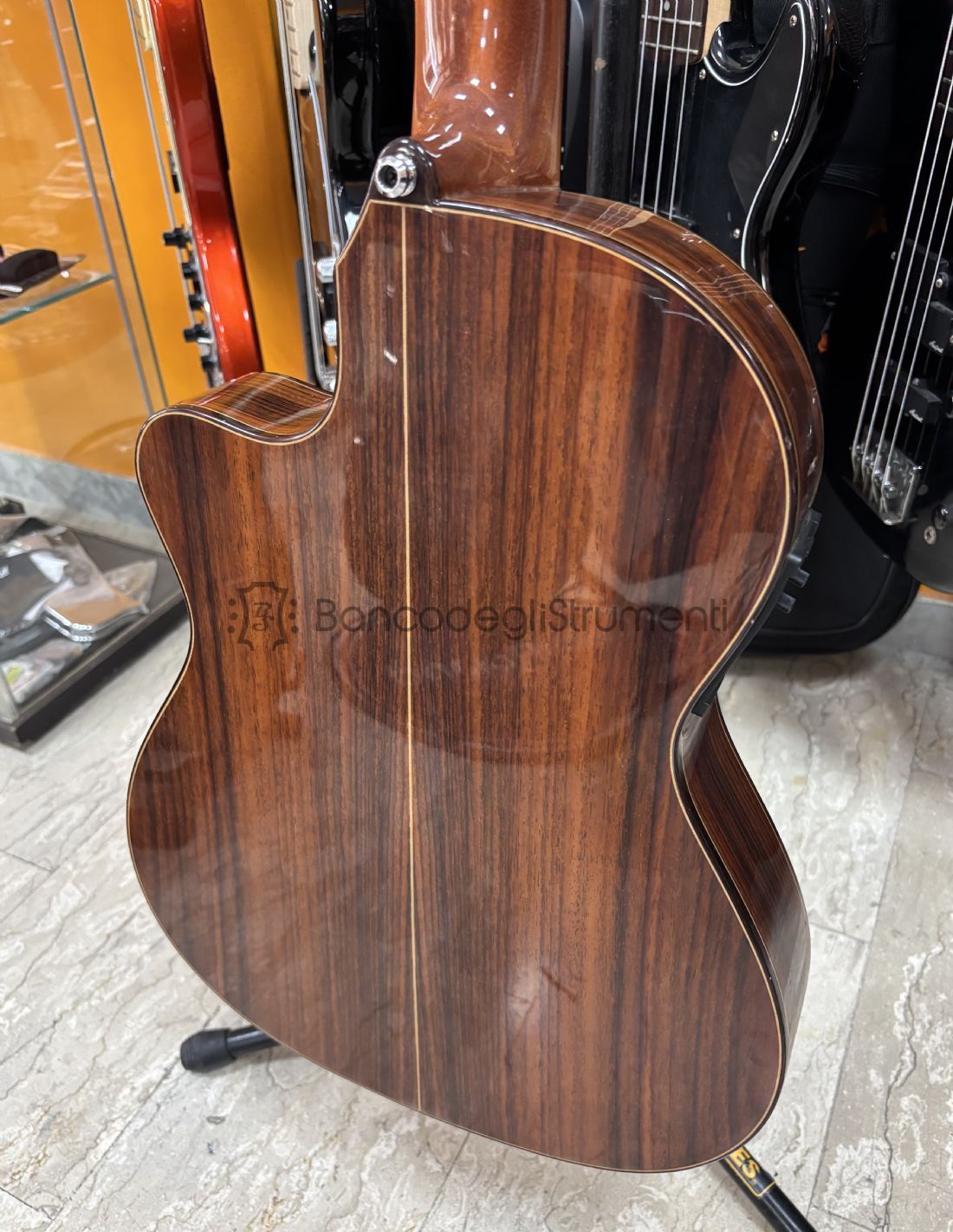 Per le fasce e il fondo è stato utilizzato il palissandro indiano, noto per la sua durevolezza e bellezza, che conferisce alla chitarra una profondità e una ricchezza tonale eccezionali, privilegiando sia i bassi risonanti che gli acuti brillanti.
