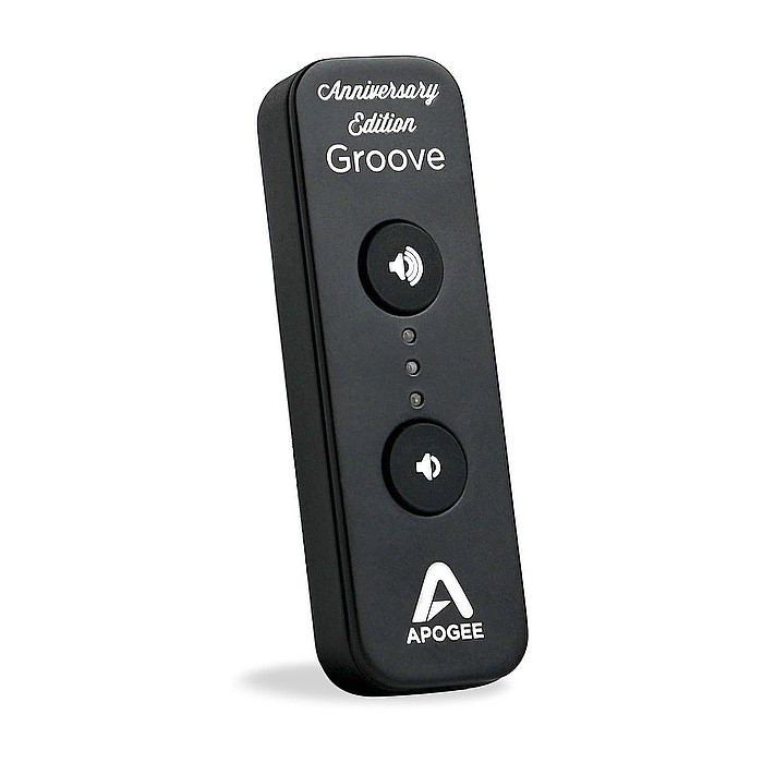Apogee Groove Anniversy Ed : Convertitore audio (DAC) USB professionale portatile e amplificatore per cuffia, con conversione a 32-bit 192 kHz, ideale per playback audio ad altissima qualità (la stessa degli studi professionali), dotato di uscita stereo linea/cuffie sbilanciata con Jack da 1/8"", chip di conversione ESS Sabre, pulsanti per la regolazionie del volume/mute, potenza di uscita 225mW su 30 Ohm, 40mW su 600 Ohm, alimentazione via USB, compatibilità con Mac OS, Windows e iOS.