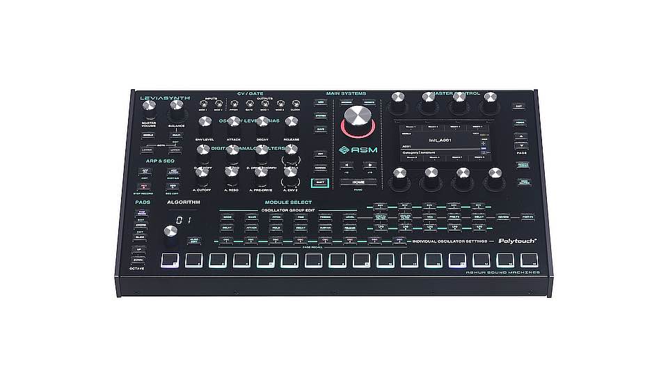 ASM Leviasynth Desktop: Sintetizzatore algoritmico ibrido a 16 voci, con 8 oscillatori per voce dotati di 144 algoritmi preimpostati, 1 algoritmo personalizzabile per patch, algoritmo morph per un numero quasi illimitato di configurazioni, oltre 300 forme d'onda e 7 modalità per la massima diversità timbrica, filtri analogici e digitali, sequencer a 3 tracce con registrazione sia l'automazione delle note che delle macro, arpeggiatore con funzione Entropy per la manipolazione avanzata delle note in tempo reale, 16 pad Polytouch® con aftertouch polifonico e sensibilità alla velocity, modalità singola per attivare tutte le 16 voci per patch, modalità multi per suddividere le voci in due parti da 8 voci ciascuna con impostazione di livelli o divisioni, touch screen multicolore con l'interfaccia utente intuitiva, compatibile con MPE, 2 uscite audio da 1/4" bilanciate (L/Mono, R), uscita cuffie da 1/4", presa USB tipo B, MIDI In/Out/Thru, 2 ingressi pedale da 1/4"(espressione, sustain), 2 ingressi da 1/8" (Mod 1, Mod 2), 5 uscite da 1/8" (CV, Gate, Mod 1, Mod 2, Clock), alimentatore esterno da 12V 2A CC, dimensioni cm 44,2 x 26,7 x 9,15, peso 4,75 kg, software Patch Manager gratuito per Mac e PC per un facile aggiornamento del firmware e la gestione delle patch.