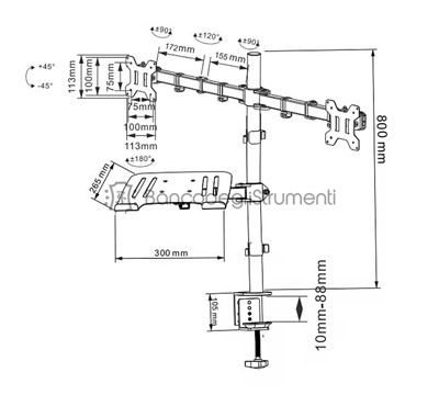 Product colour Black Screen size 13" - 32" VESA 75x75, 100x100 Dimensions: Shelf 300 x 265mm (WxD) Arm full extension 358mm Pole height 800mm Table thickness 10 - 88mm Tilt range +90°~-90° Swivel range +90°~-90° Screen rotation 360° Max. weight load per piece 8kg Weight (kg) 5,30