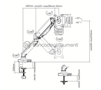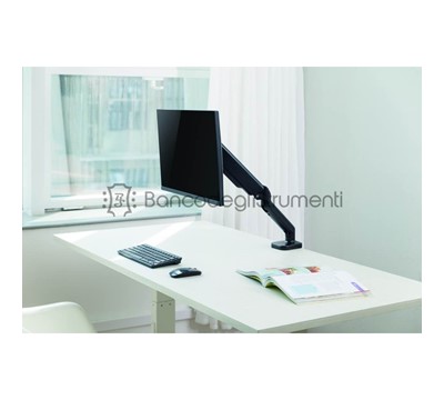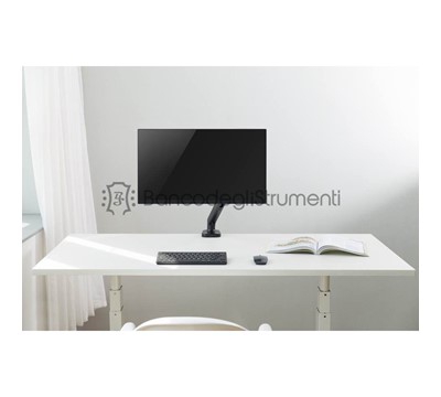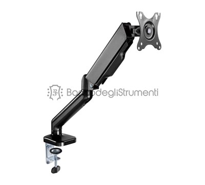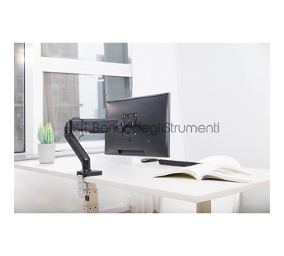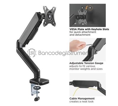 Braccio per un monitor Per monitor dai 17"ai 32"" Sistema Vesa per fissaggio e distacco rapido Molla a gas che controbilancia il peso del monitor Misuratore di tensione della molla a gas integrato Sistema passacavi integrato per organizzare fili e cavi Morsetto da tavolo e bulloni di montaggio inclusi Incluso materiale di montaggio Colore Nero