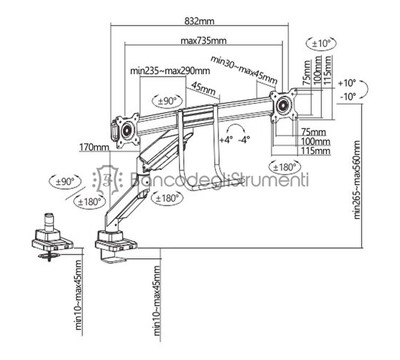 Screen size 17" - 32" VESA 75x75, 100x100 Max. weight 2x 8kg Arm full extension 430mm Tilt range +10°~-10° Swivel range +10°~-10° Screen rotation +180°~-180° Weight 1,00