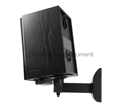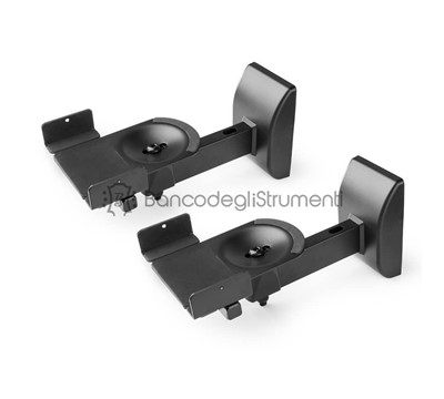 Supporto per altoparlanti con bloccaggio laterale Design universale Cuscinetto in schiuma per proteggere i diffusori Possibilità di inclinazione e rotazione Sistema di gestione dei cavi Sistema di gestione dei cavi Colore: nero opaco Set di 2 supporti da parete