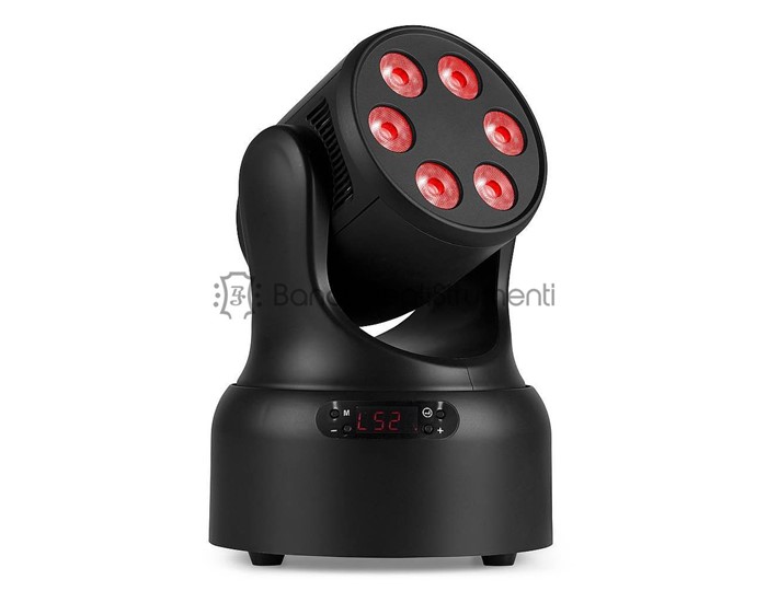 Testa mobile Wash 6 LED ad alta potenza 4 in 1 da 8 W Colori: RGBW DMX, programmazione automatica o modalità standalone Attivazione sonora con sensibilità regolabile Dimmer elettronico Intervallo di panoramica e inclinazione: panoramica 540° / inclinazione 270° Panoramica e inclinazione eccellenti Pannello di controllo con display LED Ingresso/uscita DMX tramite XLR a 3 pin Ingresso alimentazione IEC Anello di montaggio per soffitto opzionale (156.025 Nero, 156.026 Bianco)