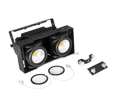 SB220IP StageBlind.IP65 2x100W WW/A : Lo Stage Blinder SB220IP con grado di protezione IP65 è un potente apparecchio di illuminazione a LED con un robusto design in alluminio dotato di LED COB (Chip-on-Board) che combina due effetti nel suo alloggiamento.