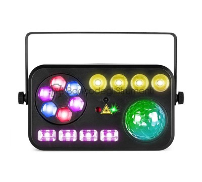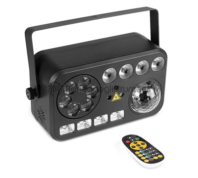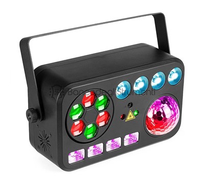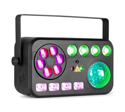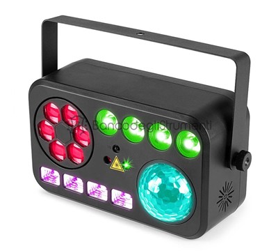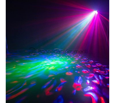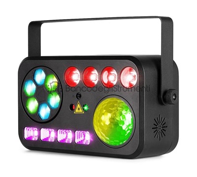 Effetto 6 in 1 con LED Bee Eye, Water Wave, PAR, luce UV, strobo e doppio effetto pattern Effetto LED Bee Eye con 6 LED RGBW da 8 W Effetto Onda d'Acqua con LED RGBW da 10W Effetto luce PAR con 4 LED PAR RGBW da 4 W Effetto combinato UV/strobo con 4 LED bianchi/UV Effetto motivo rosso/verde Modalità DMX e stand-alone Funzione master/slave Attivazione sonora con sensibilità regolabile Modalità automatica con spettacoli pre-programmati Portatile e facile da installare e utilizzare Basso consumo energetico Ingresso/uscita DMX tramite XLR a 3 pin Pannello di controllo con display LED Telecomando IR