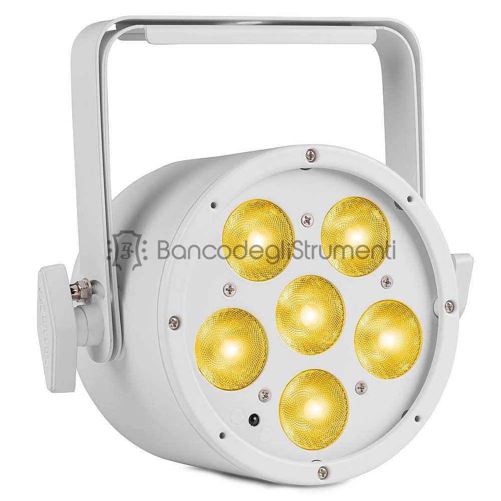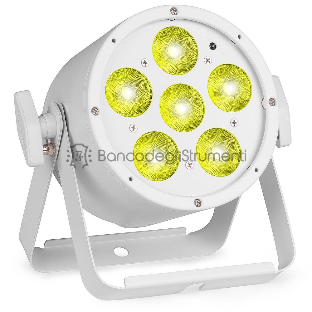 PAR leggero in alluminio con 6 LED 6 in 1 da 10 W RGBALC Miscelazione colori (Rosso/Verde/Blu/Ambra/Lime/Ciano) 6, 8, 10 o 11 canali DMX Modalità DMX e Stand-alone Dimmer elettronico 0-100%. Funzione Master/Slave Controllo remoto IR Ingresso/uscita DMX tramite XLR a 3 pin Show pre-programmati Attivazione sonora con sensibilità regolabile Modalità automatica con velocità regolabile Pannello di controllo con display OLED Ingresso/uscita connettore P-Con Colore: bianco