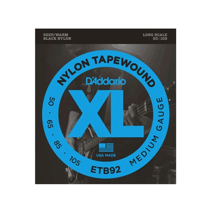 Il set di corde D'Addario in Nylon nero ETB92 Tapewound offre una combinazione ideale di suoni caldi e profondi con un tocco ultra-liscio. Questo set offre suoni vintage che vanno dal "thump" di un contrabbasso alla profondità concentrata delle corde lisce tradizionali. Adatte per bassi con una lunghezza della scala fino a 36 pollici. Sono avvolte con un nylon nero piatto che viene lucidato per una finitura ultra-liscia. Queste corde ben bilanciate, durature, sono sapientemente progettate per fornire una tensione ottimale e sono calibrate per adattarsi correttamente su sellette di basso standard. Le Tapewounds possono essere usate su bassi con tasti o fretless e sono progettati per offrire un suono vintage.