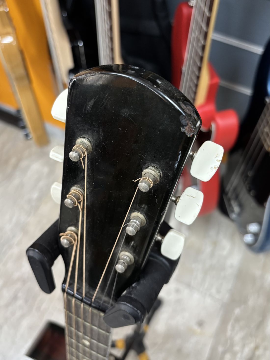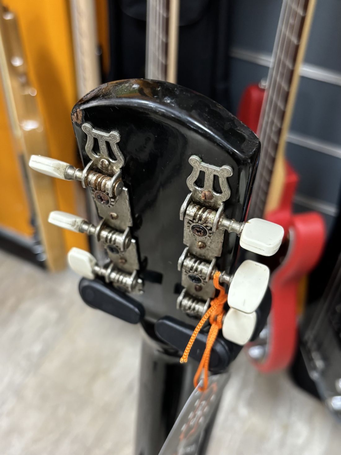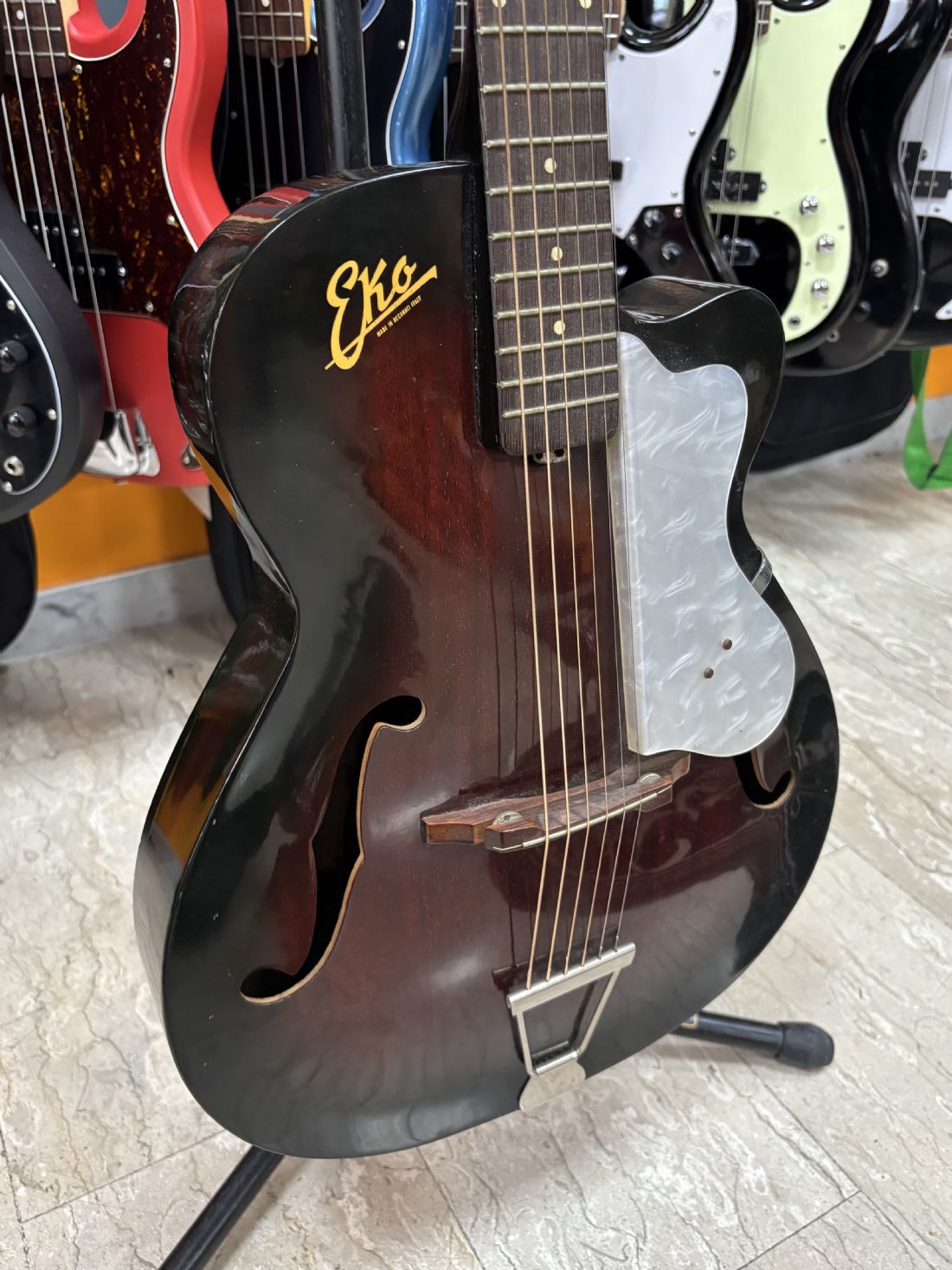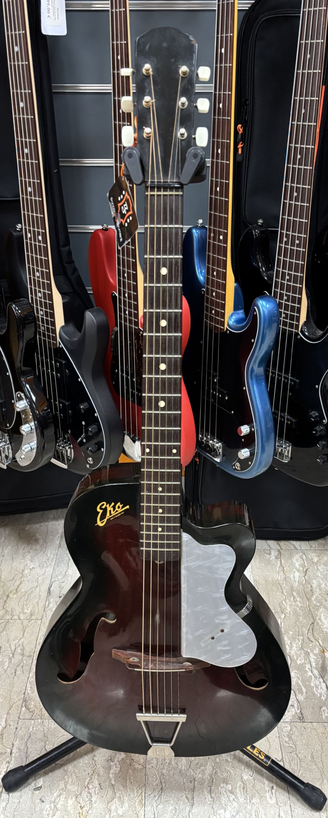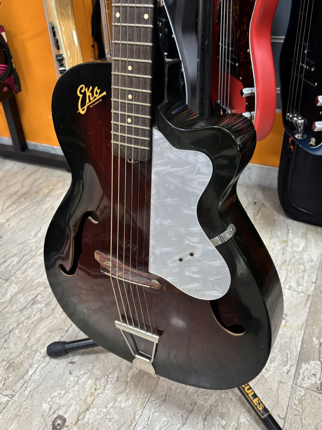 La Eko Mascot 100 è una chitarra semi-acustica dal carattere vintage, compatta e leggera, con cassa sottile e buchi a effe.