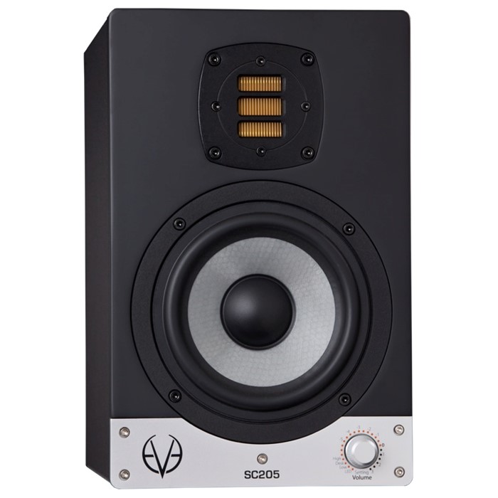 Eve Audio Sc205 Promo: Monitor da studio professionale, a due vie, attivo, dotato di woofer schermato da 5"" in fibra di vetro, tweeter a nastro con trasduttore Air Motion da 1"", pot posteriore, filtri basati su DSP per la regolazione della risposta in frequenza, push knob per il controllo del volume e della risposta acustica, convertitori A/D Burr-Brown di altissima qualità, ingresso analogico XLR bilanciato e RCA sbilanciato, risposta in frequenza 53Hz-21kHz, amplificatori distinti per bassi e acuti con potenza di 2x50W (picco) ciascuno, SPL 101 dB, pulsante on/off, inserti filettati nel pannello posteriore per il fissaggio a parete, su asta microfonica o stativo per speaker.