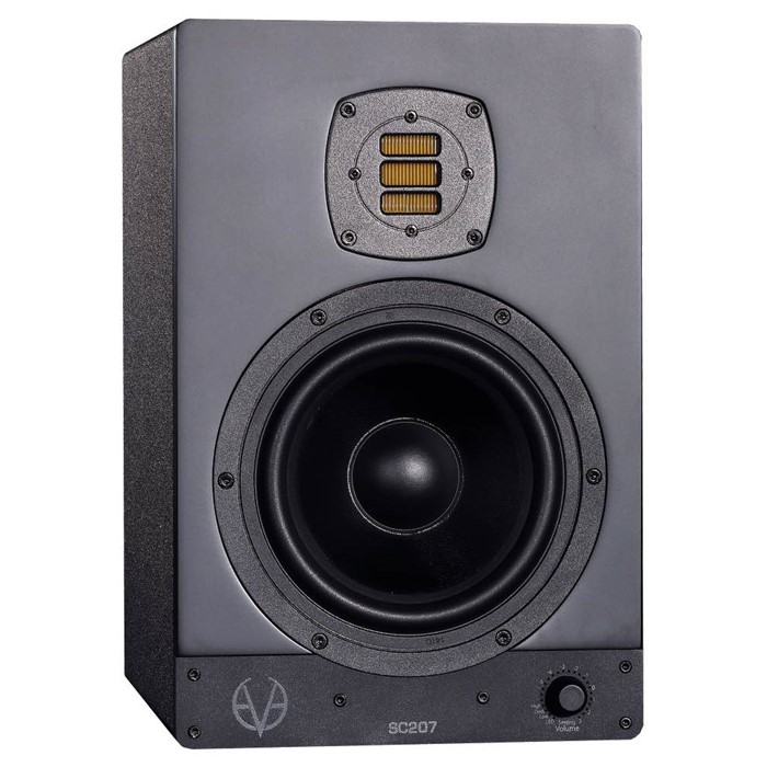 Eve Audio SC207 All Black Ed promo: Monitor da studio professionale, a due vie, attivo, dotato di woofer schermato da 6.5"" in fibra di vetro, tweeter a nastro con trasduttore Air Motion da 2"", pot posteriore, filtri basati su DSP per la regolazione della risposta in frequenza, push knob per il controllo del volume e della risposta acustica, convertitori A/D Burr-Brown di altissima qualità, ingresso analogico XLR bilanciato e RCA sbilanciato, risposta in frequenza 44Hz-21kHz, amplificatori distinti per bassi e acuti con potenza di 1x50W + 1x100W (picco), SPL 106 dB, pulsante on/off.