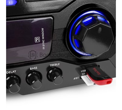Dotato di telecomando, due ingressi microfonici con controllo dei toni, echo e display dinamico.