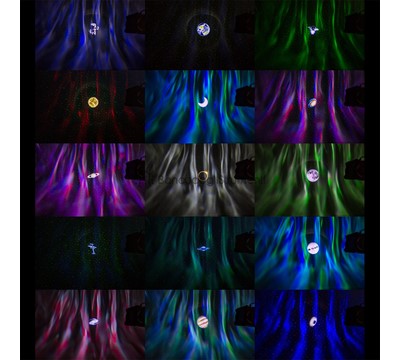 Spettacolare proiettore Aurora "Northern Lights”. 4x 2W RGBW e 1x LED bianchi ad alta potenza 15 lenti intercambiabili con proiezioni dall'universo Effetto luce del nord con onde colorate Raggi laser rossi e verdi Lettore mini-SD integrato con altoparlante Connessione BT per lo streaming audio Telecomando IR Modalità attiva automatica e sonora Alimentato dalla batteria integrata Ricarica tramite USB-C, escl. Alimentazione elettrica