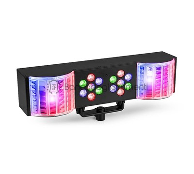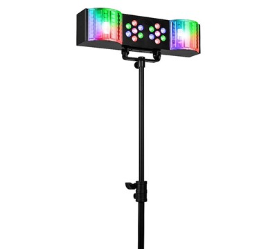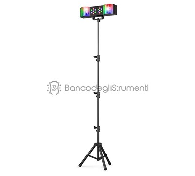 Party Bar con doppio effetto Derby e due effetti wash Effetto Derby con 3 LED RGB ad alta potenza (2x) Wash LED con 7 LED RGB super luminosi (2x) Modalità di riproduzione automatica e attivata da suono Facile da installare e utilizzare Basso consumo energetico Supporto luce e telecomando inclusi Leggero e perfetto per le feste