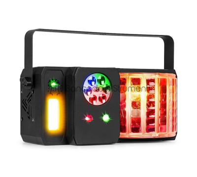 Effetto 5 in 1 con proiettore Gobo, effetto farfalla LED, strobo e effetto doppio motivo Effetto Gobo Protector con 6 LED RGBW da 8 W Effetto Farfalla con 3 LED RGB da 3W Stroboscopio bianco 10W Effetto motivo rosso/verde Modalità DMX e stand-alone Funzione master/slave Attivazione sonora con sensibilità regolabile Modalità automatica con spettacoli pre-programmati Portatile e facile da installare e utilizzare Basso consumo energetico Ingresso/uscita DMX tramite XLR a 3 pin Pannello di controllo con display LED Controllo remoto RF
