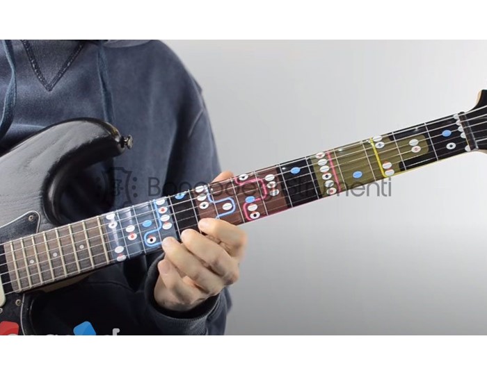 GuiMaps è una guida visiva pensata per facilitare l'apprendimento nemonico delle diteggiature sulla chitarra. Aderisce senza colle, è pù volte riposizionabile e non lascia residui.