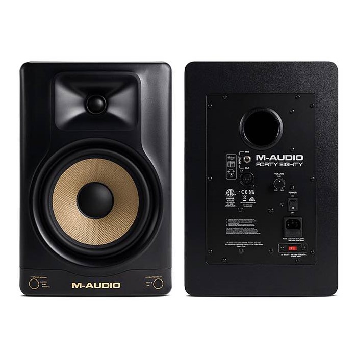 M-Audio Forty Eighty  promo: Monitor near field da studio, con DSP integrato, convertitore Burr-Brown, bi-amplificato con 80W per i bassi e 70W per gli acuti, woofer in Kevlar schermato da 8”, tweeter in seta da 1.25”, selezione di differenti modalità di ascolto incluse curve di EQ personalizzabili tramite App Android e iOS, porta per le basse frequenze posteriore, ingresso XLR e jack da 1/4“ bilanciato/sbilanciato, connettività Bluetooth 5.0, regolazione del volume, power on/off.