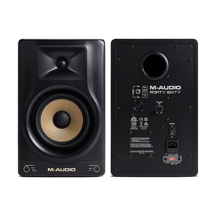 M-Audio Forty Sixty promo: Monitor near field da studio, con DSP integrato, convertitore Burr-Brown, bi-amplificato con 60W per i bassi e 40W per gli acuti, woofer in Kevlar schermato da 6,5”, tweeter in seta da 1”, selezione di differenti modalità di ascolto incluse curve di EQ personalizzabili tramite App Android e iOS, porta per le basse frequenze posteriore, ingresso XLR e jack da 1/4“ bilanciato/sbilanciato, connettività Bluetooth 5.0, regolazione del volume, power on/off.