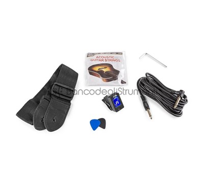 Il kit viene fornito con una borsa da trasporto in nylon resistente, un accordatore digitale, plettri, una tracolla per chitarra e un set di corde di ricambio.