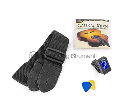 Questo pacchetto include anche corde di ricambio, tracolla per chitarra, accordatore digitale, plettri e una custodia in nylon per trasportare la chitarra per esercitarsi o esibirsi.