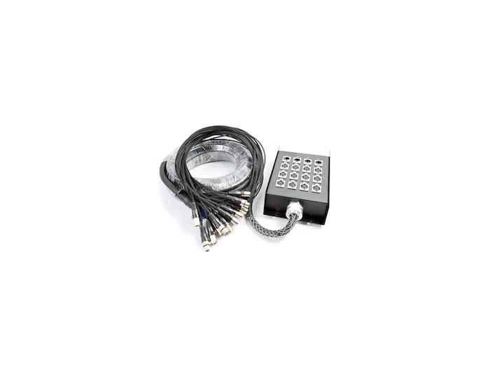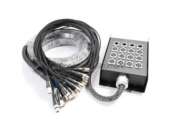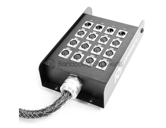Il multi-cavo ha 12 ingressi (femmina) e 4 uscite (maschio) sullo stagebox, perciò consente di inviare i segnali microfonici al mixer e inviare monitor da pavimento al palco.