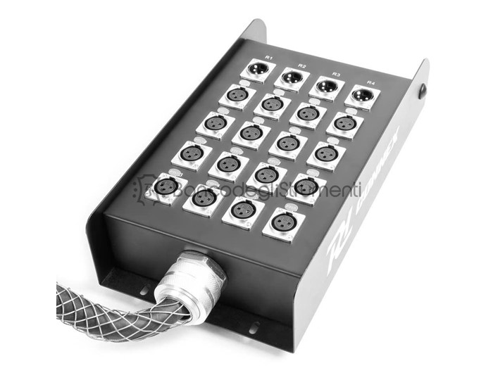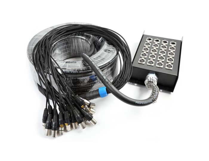 Il multi-cavo ha 16 ingressi (femmina) e 4 uscite (maschio) sullo stagebox, perciò consente di inviare i segnali microfonici al mixer e inviare monitor da pavimento al palco.
