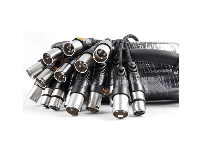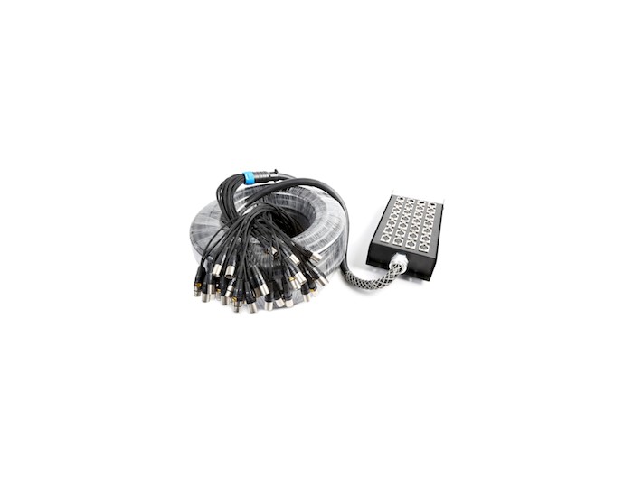 Il multi-cavo ha 24 ingressi (femmina) e 4 uscite (maschio) sullo stagebox, perciò consente di inviare i segnali microfonici al mixer e inviare monitor da pavimento al palco.