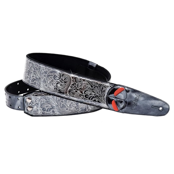 Righton! Straps Revolver Titanium: Tracolla realizzata in modo artigianale con materiali ecologici ad alta tecnologia rispettosi dell’ambiente e priva di qualsiasi tessuto animale, caratterizzata da finitura in sfoglia di alluminio decorata con motivi floreali,imbottitura in lattice ad alta densità (5 mm), sistema di regolazione RAS, porta plettri incorporato.