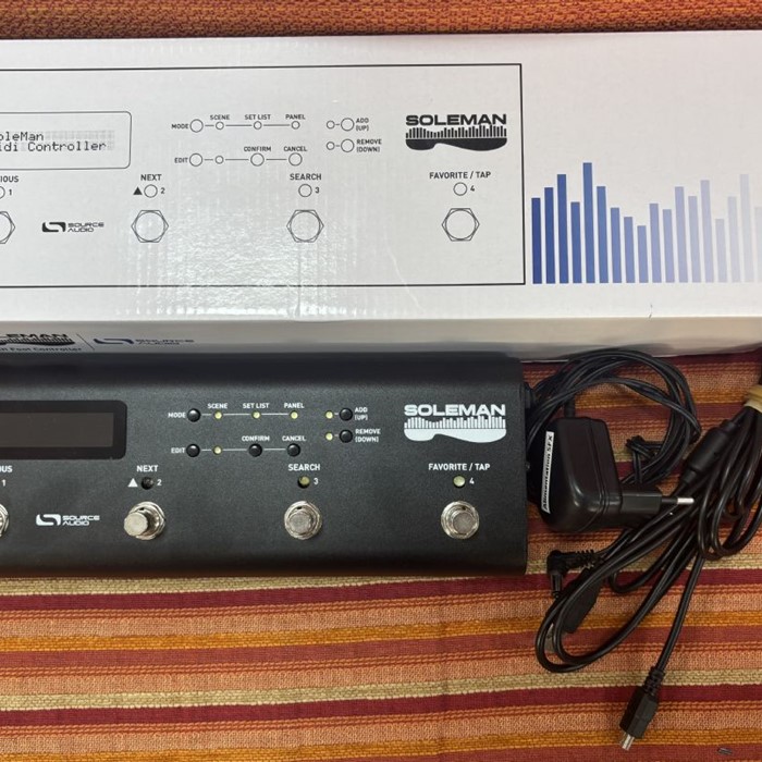 I quattro footswitch scorrono le scene, lanciano i singoli messaggi MIDI, passano attraverso scalette, o attivano le macro MIDI estremamente personalizzabili. Una porta per switch esterno permette a due pedali aggiuntivi di rendere la navigazione più comoda. In modalità Scene, il Soleman scorre i programmi in ordine sequenziale e invia i messaggi Program Change, messaggi Note On, o Macro.