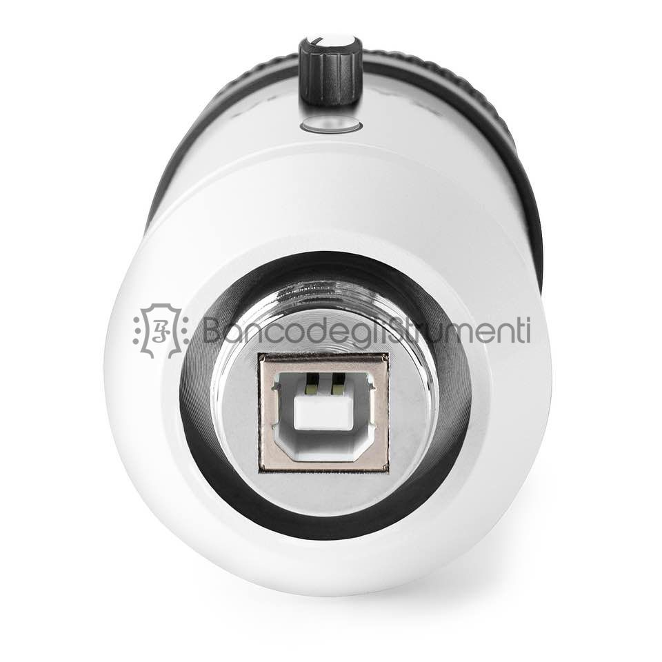 Microfono a condensatore con connessione USB Scheda audio integrata Guadagno e livello di eco regolabili Collegamento delle cuffie (3,5 mm) Pulsante Mute (LED blu = ON, LED rosso = OFF) Registrazione di alta qualità Eccellente proiezione vocale Connettività USB Plug and Play Robusto involucro in metallo Alta compatibilità (Windows, Mac OS) Colore: bianco Il kit comprende anche: Treppiede pieghevole Filtro in schiuma Cavo USB da A a B Adattatore da 3/8'' a 5/8''