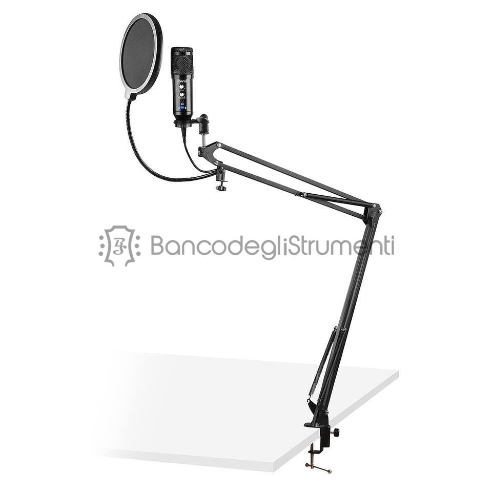 Microfono a condensatore con uscita USB Scheda audio integrata Guadagno e livello di eco regolabili Connettore per cuffie (3,5 mm) Pulsante Mute (LED blu = ON, LED rosso = OFF) Registrazione di alta qualità Eccellente proiezione vocale Connettività Plug & Play USB Robusto involucro in metallo per una maggiore longevità Alta compatibilità (Windows, Mac OS) Colore: nero Il kit comprende anche: Supporto per braccio a forbice con sospensione regolabile Filtro pop sul collo d'oca Filtro in schiuma Cavo USB da A a B Adattatore da 3/8'' a 5/8''
