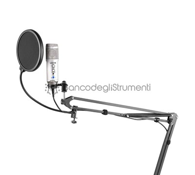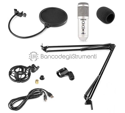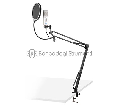 Microfono a condensatore con uscita USB Scheda audio integrata Guadagno e livello di eco regolabili Connettore per cuffie (3,5 mm) Pulsante Mute (LED blu = ON, LED rosso = OFF) Registrazione di alta qualità Eccellente proiezione vocale Connettività Plug & Play USB Robusto involucro in metallo per una maggiore longevità Alta compatibilità (Windows, Mac OS) Colore: Titanio Il kit comprende anche: Supporto per braccio a forbice con sospensione regolabile Filtro pop sul collo d'oca Filtro in schiuma Cavo USB da A a B Adattatore da 3/8'' a 5/8''