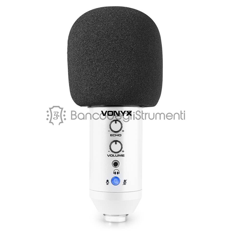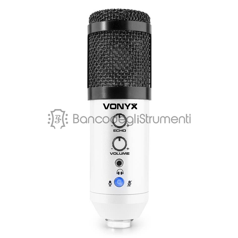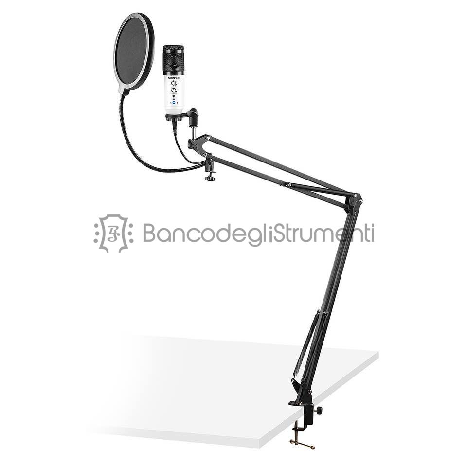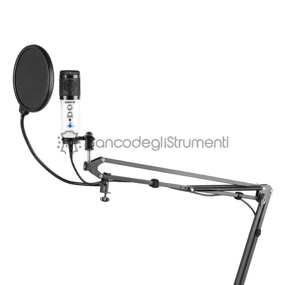 Microfono a condensatore con uscita USB Scheda audio integrata Guadagno e livello di eco regolabili Connettore per cuffie (3,5 mm) Pulsante Mute (LED blu = ON, LED rosso = OFF) Registrazione di alta qualità Eccellente proiezione vocale Connettività Plug & Play USB Robusto involucro in metallo per una maggiore longevità Alta compatibilità (Windows, Mac OS) Colore: bianco Il kit comprende anche: Supporto per braccio a forbice con sospensione regolabile Filtro pop sul collo d'oca Filtro in schiuma Cavo USB da A a B Adattatore da 3/8'' a 5/8''