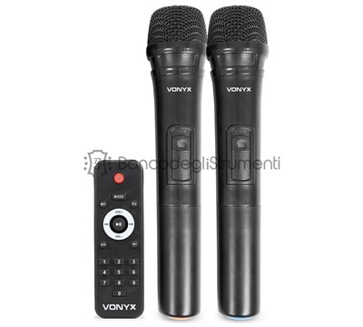 SPJ-PA912 Mobile Amp ABS 12 2 UHF: Set audio professionale che include 2 microfoni UHF wireless che funzionano su frequenze diverse, controllo remoto ed entrate USB e SD per la riproduzione di MP3.