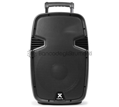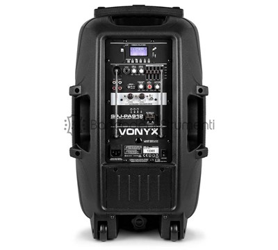 Sistema audio attivo da 12 "500 W. Driver in titanio da 1 " Ricevitore BT per streaming audio Indicatore del livello della batteria Effetto eco per microfoni Controllo del volume per ogni microfono UHF USB integrato, lettore multimediale SD / MMC Telecomando per lettore MP3 Alimentazione da rete o batteria 12V Carrello integrato con maniglia telescopica Robusto case in ABS