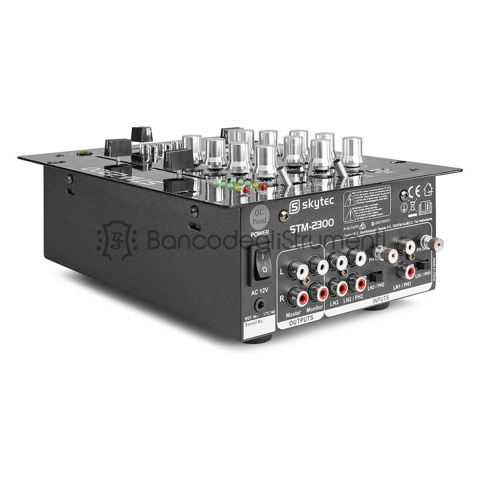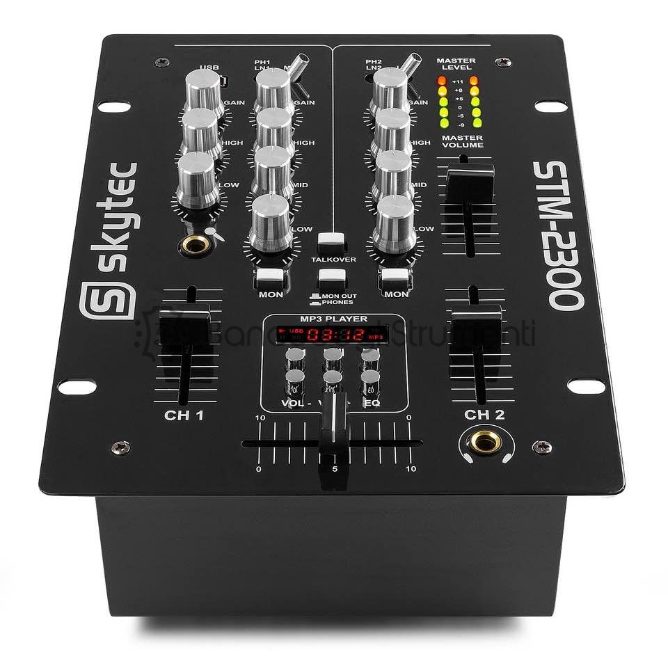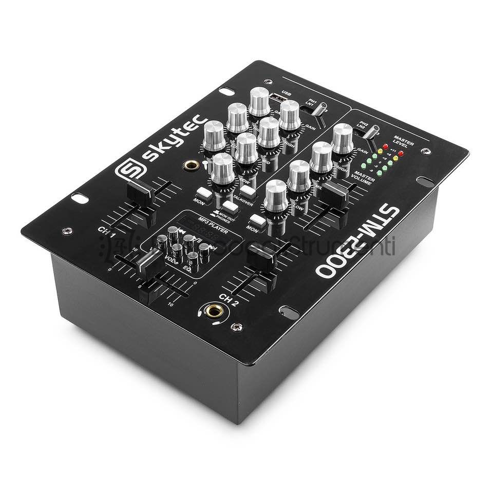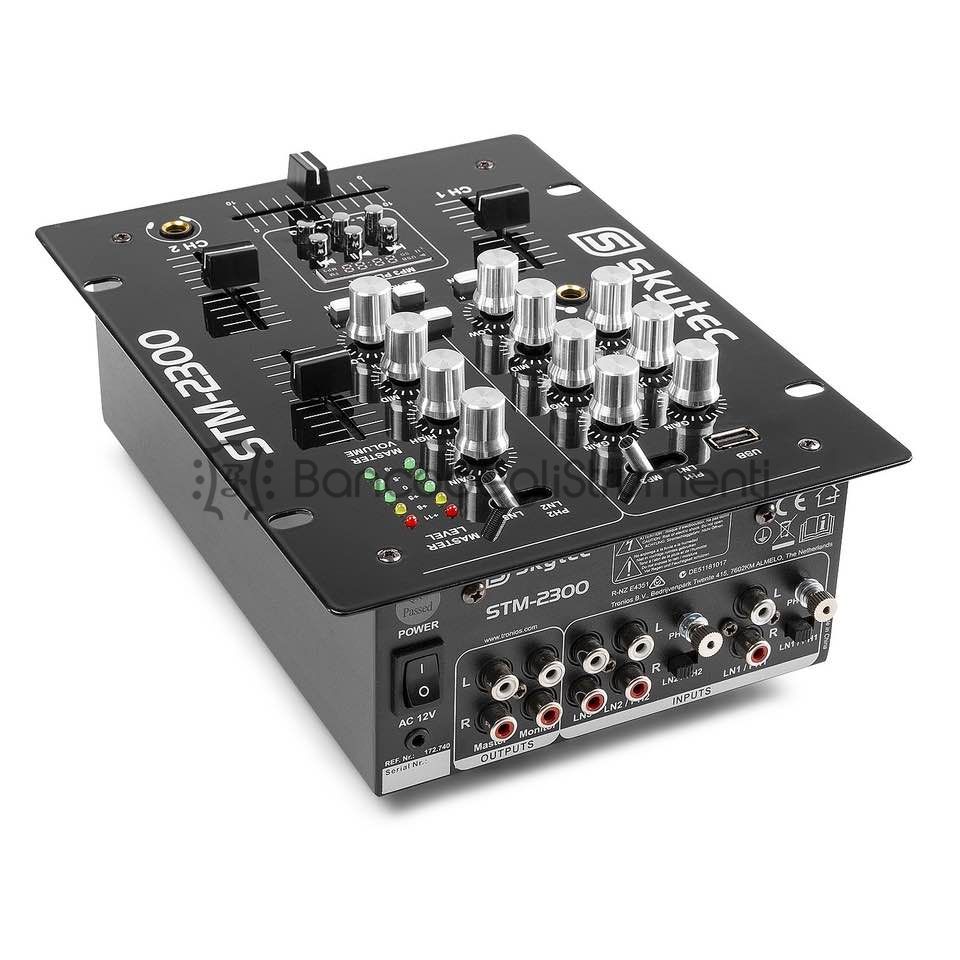 Il mixer a 2 canali è dotato di ingressi phono/line commutabili e di un'uscita master e una per il monitor.