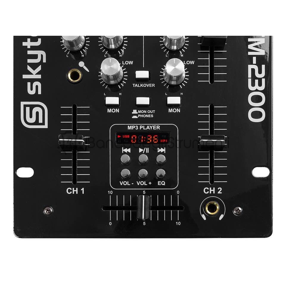 Mixer a 2 canali Lettore MP3 Porta USB con controllo e visualizzazione MP3 EQ a 3 bande su ogni canale EQ microfonici a 2 bande Linea e fono commutabili su ogni canale Cuffie e monitor Uscita AMP e REC