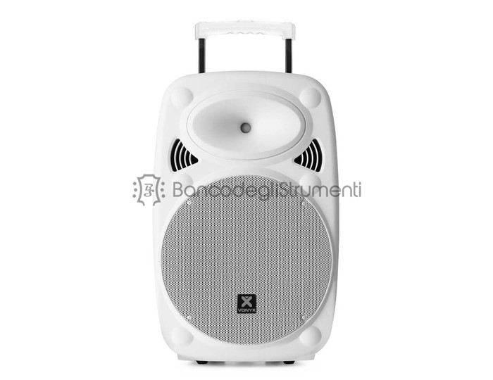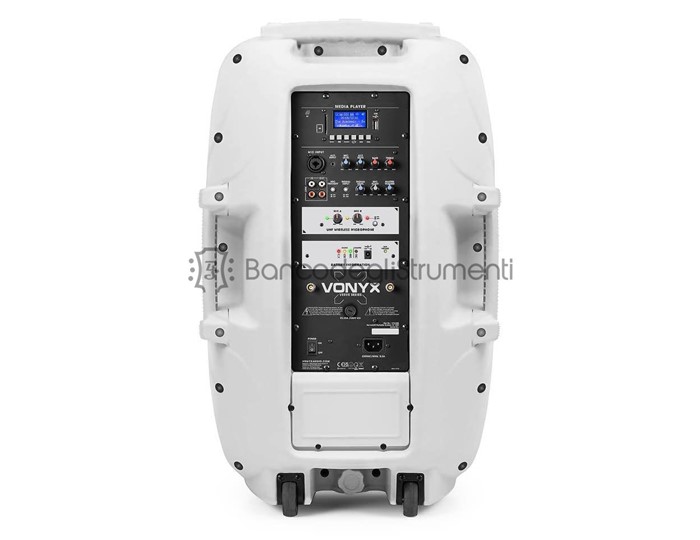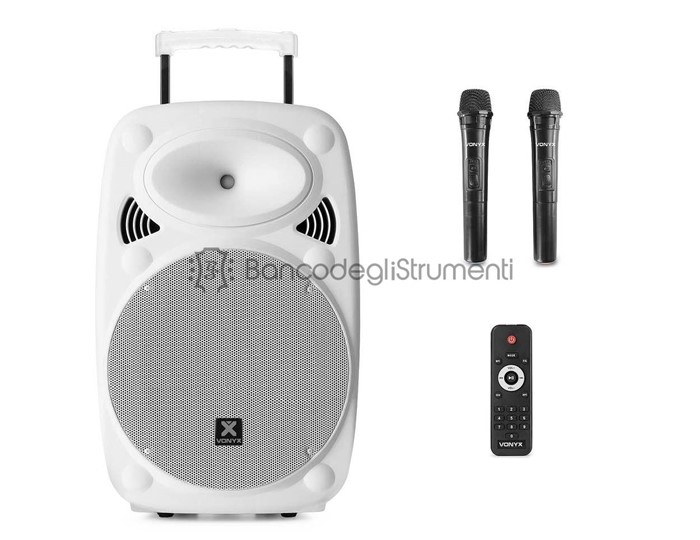 Sistema audio portatile tutto in uno Include 2 microfoni palmari UHF con effetto eco Semplice da configurare e utilizzare Nessun background tecnico richiesto Porta USB e slot per scheda SD e ingresso AUX Potenza massima di 1000 W grazie all'amplificazione in classe D ad alte prestazioni Ricevitore BT per lo streaming audio Robusto corpo in plastica ABS resistente agli urti - estremamente durevole Fino a 7 ore di utilizzo continuo con una carica completa della batteria Unità di controllo della batteria con indicatore di stato e di carica Ampio display grafico con tag ID3 (informazioni sul titolo dei file MP3) Equalizzatore a 2 bande Controlli di tono (bassi e alti) e riverbero eco Tirare la maniglia, le ruote e la maniglia per il trasporto per un facile trasporto Staffa di montaggio per treppiede da 35 mm nella base Telecomando completo per lettore multimediale IR-eye nella parte anteriore per un facile controllo