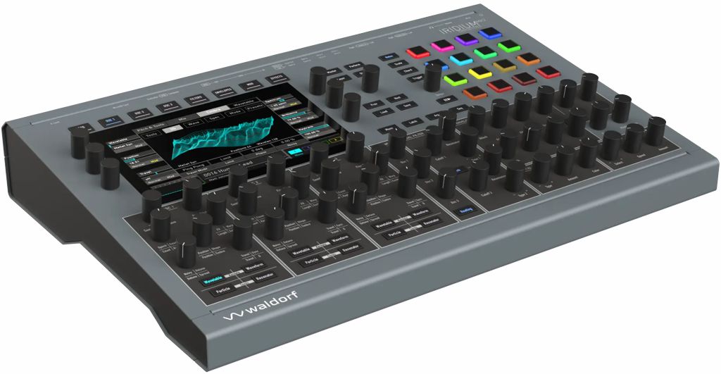 Waldorf Iridium Desktop MK2: Sintetizzatore polifonico ibrido a 16 voci con il moteore sonoro di Quantum (il modello di punta di Waldorf) ma senza tastiera, con sintesi ibrida per offrire suoni futuristici possibili solo con i synth software altamente programmabili di oggi, equipaggiato con display touchscreen di grandi dimensioni, 56 manopole e 40 pulsanti, 16 pad in silicone con illuminazione RGB ideali per suonare note, accordi, arpeggi e sequenze, multitimbrico a 4 parti, fino a 7000 preset (interscambiabili con Quantum e con possibilità di caricare quelli di Waldorf Nave), memoria flash interna da 6 GB (preset, sample, wavetables) e slot per schede SD, 3 oscillatori digitali (wavetable, classical, granular sampler, resonator), 3 filtri stereo, 6 LFO, arpeggiatore polifonico, matrice di modulazione con 40 slot, step sequencer con step recording, automazione parametri, quantizzazione pitch basata su scala, 5 effetti, 2 ingressi audio da 1/4", 2 uscite audio da 1/4", uscita cuffie con controllo volume, prese USB tipo B (per il collegamento al computer) e tipo A (per il collegamento di controller USB/MIDI), prese MIDI In/Out/Thru/USB, 4 CV inputs più Gate In, Trigger In, Clock In, Clock Out, alimentazione 110-240V, dimensioni 440 x 305 x 85 mm, peso 5,4 kg, possbilità di montaggio a rack con supporti opzionali (disponibili in seguito).