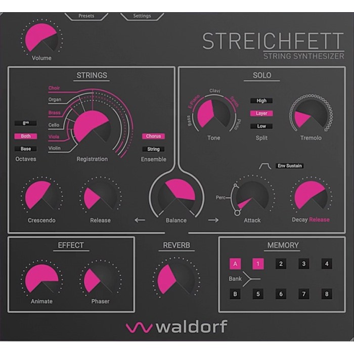 Waldorf Streichfett Plugin: Sintetizzatore software che combina il meglio dei synth di archi degli anni 70 e primi anni 80, disponibile come plug-in VST/AU per una facile integrazione con i software DAW più diffusi, caratterizzato da doppio motore sonoro con una sezione di archi a 128 voci, morphing continuo di violino, viola, violoncello, ottoni, organo, coro e altro ancora, una sezione Solo a 8 voci, morphing continuo di Bass, E-Piano, Clavi, Synth e Pluto per Solo Tone, effetti Animate, Ensemble/Chorus, Phaser e Reverb, split/layer per la sezione solo.