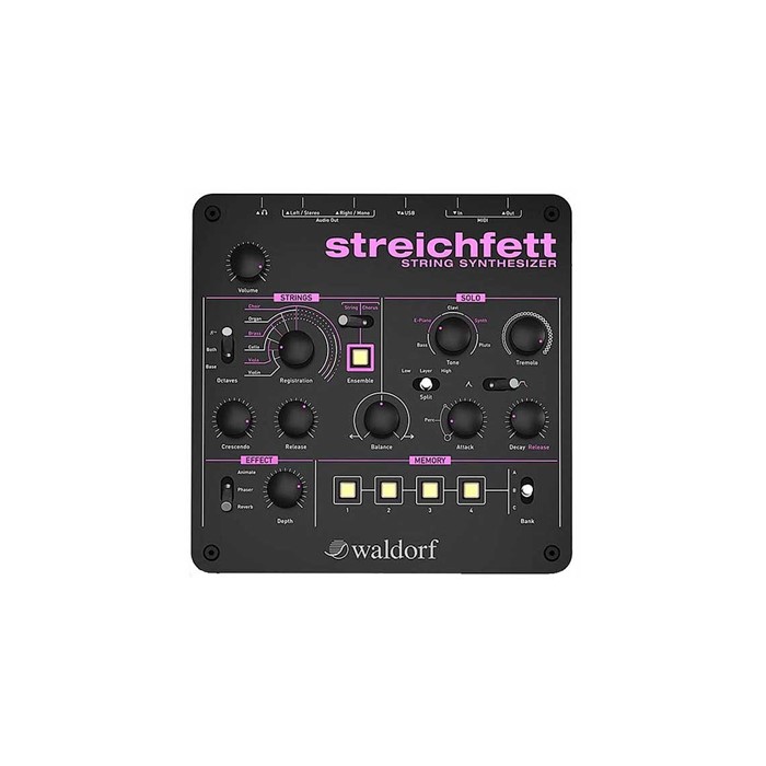 Waldorf Streichfett Promo: Sintetizzatore che combina il meglio dei synth di archi degli anni 70 e primi anni 80, caratterizzato da doppio motore sonoro con una sezione di archi a 128 voci, una sezione Solo a 8 voci, effetti Animate, Ensemble/Chorus, Phaser e Reverb, split/layer per la sezione solo, 12 preset programmabili, formato tabletop equipaggiato con 8 potenziometri, 1 encoder, 5 pulsanti retroilluminati, 6 interruttori, 2 uscite audio da 1/4"", uscita stereo 1/8"" per cuffie, MIDI In/Out/USB, presa USB di tipo B per il collegamento al computer e l’alimentazione (alimentatore USB incluso), dimensioni 185 x 185 x 65 mm, peso 0,9 kg.