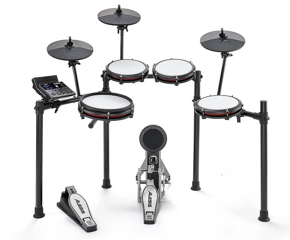 Alesis Nitro Max Kit promo: Batteria elettronica serie Nitro, con pelli mesh per una risposta naturale e bassa rumorosità ambientale, equipaggiata con pad rullante da 10” a due zone, 3 pad tom da 8”, pad hi-hat completo di pedale, crash (con funzione choke) e ride da 10”, torretta kick drum completa di pedale, rack in alluminio solido e stabile, centralina/modulo sonoro, alimentatore, cavi di collegamento, chiavi per montaggio e copia di bacchette.