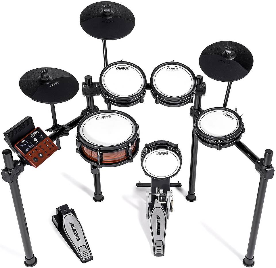 Alesis Nitro Pro Kit: Batteria elettronica serie Nitro, con pelli mesh per una risposta naturale e bassa rumorosità ambientale, equipaggiata con pad rullante profondo da 10” a due zone, 3 pad tom da 8” a due zone, pad hi-hat da 10” a due zone completo d pedale; pad crash da 10” a due zone (con funzione choke); pad ride da 10” a due zone, torretta kick drum da 8” con pelle mesh completa di pedale, rack in acciaio solido e stabile, centralina/modulo sonoro, alimentatore, cavi di collegamento, chiavi per montaggio e copia di bacchette.