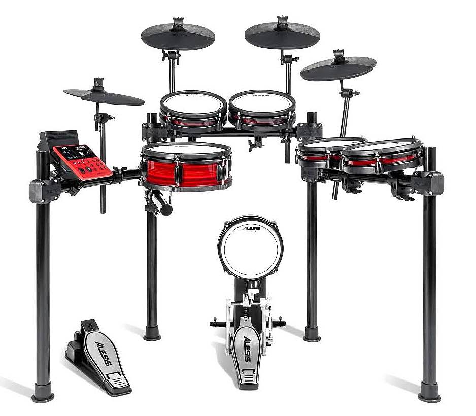 Alesis Nitro Pro Xl Kit promo: Batteria elettronica serie Nitro, con pelli mesh per una risposta naturale e bassa rumorosità ambientale, equipaggiata con pad rullante profondo da 10” a due zone, 4 pad tom da 8” a due zone, pad hi-hat da 10” a due zone completo di pedale, pad crash da 10” a due zone (con funzione choke), pad ride da 10” a due zone, torretta kick drum da 8” con pelle mesh completa di pedale, rack in acciaio solido e stabile, centralina/modulo sonoro, alimentatore, cavi di collegamento, chiavi per montaggio e copia di bacchette.