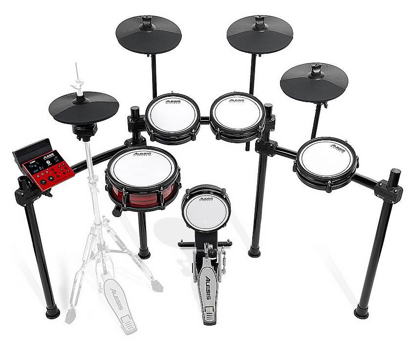 Alesis Nitro Ultimate Kit: Batteria elettronica serie Nitro, con pelli mesh per una risposta naturale e bassa rumorosità ambientale, equipaggiata con pad rullante profondo da 10” a due zone e cerchio in metallo, 3 pad tom da 8” a due zone e cerchio in metallo, pad hi-hat da 10” a 2 zone, con controller Active Magnetic (da installare su supporto tradizionale per charleston, non incluso), 2 pad crash da 10” a due zone (con funzione choke), pad ride a due zone da 10”, torretta kick drum da 8” con pelle mesh completa di pedale, rack in acciaio solido e stabile, centralina/modulo sonoro, alimentatore, cavi di collegamento, chiavi per montaggio e copia di bacchette.