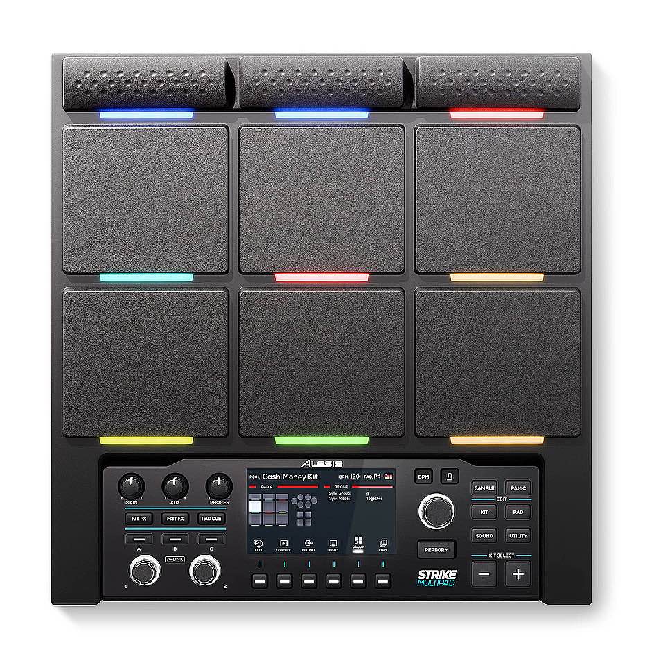 Alesis Strike Multipad promo: Strumento/controller percussivo avanzato con sampler e looper integrati, ideale per batteristi e performer esigenti, dotato di 9 pad sensibili alla velocity con illuminazione RGB, oltre 8.000 suoni e loop con più di 6 GB di contenuti (batterie, percussioni e strumenti melodici), 32 GB di memoria interna, il caricamento di sample personalizzati, campionatore per la registrazione da qualsiasi sorgente (microfono, smartphone, computer, ingressi audio), looper audio in tempo reale, 5 processori di effetti integrati (3 kit FX, 1 master FX, 1 comp/EQ), display LCD a colori, manopole e pulsanti di controllo, porta USB-B per utilizzo come interfaccia audio 2 in/2 out e l’invio di dati USB-MIDI (Mac e PC), porta USB-A per flash memory, connessioni MIDI In/Out, 4 uscite audio da 6,35 mm, 2 uscite cuffie con jack da 6,35 mm e da 3,5 mm, 2 ingressi audio con jack da 6,35 mm per campionamento, 3 ingressi trigger aggiuntivi (1 singola zona + 2 doppia zona), ingresso per pedale hi-hat e 2 ingressi footswitch di sistema, dimensioni 349 × 356 × 76 mm, peso 3,85 kg.