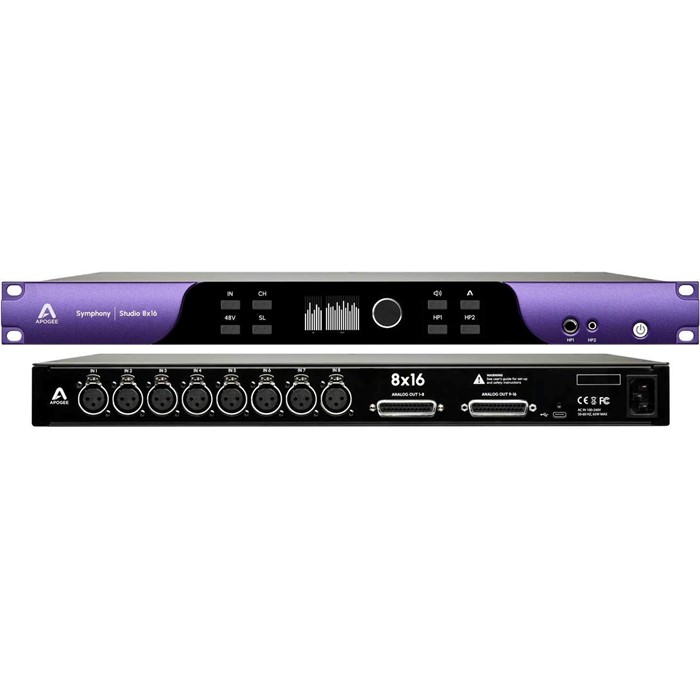 Apogee Symphony Studio 8X16 promo: Interfaccia audio professionale USB-C per Mac e Windows, dotata di DSP in ingresso e in uscita, display OLED, tasti di selezione e manopola di controllo multifunzione, conversione AD/DA 192 KHz con qualità Apogee Symphony, 8 ingressi audio bilanciati XLR line/mic con gain di 75dB, softclip, phantom power 48V, 16 uscite audio bilanciate con connettori D-SUB 25, 2 uscite per cuffia con jack da 1/4"" e 1/8”.