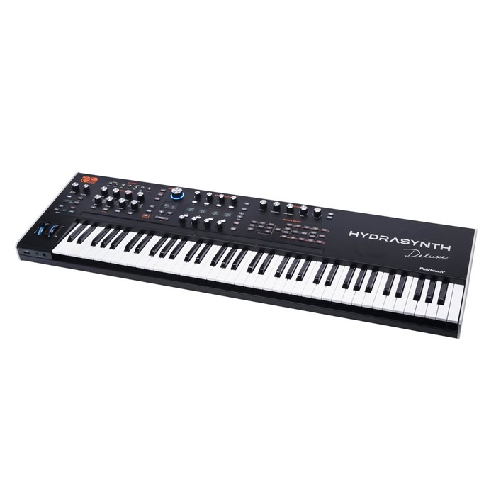 Asm Hydrasynth Deluxe: Sintetizzatore wavetable a 16 voci (espandibili collegando un secondo Hydrasynth), con motore di sintesi estremamente avanzato, dotato di 3 oscillatori con numerosi mutator (FM-Linear, Wavestack, Hard Sync, Pulse Width, PW-Squeeze, PW-ASM, Harmonic Sweep), 2 filtri utilizzabili in serie o in parallelo, 4 modificatori di inviluppo (HAHDSR), 5 LFO, una avanzata matrice di modulazione, oltre ad effetti ed arpeggiatore, 5 banchi di memoria da 128 patch ciascunoo, 5 display OLED, tastiera a 73 tasti standard con velocity e aftertouch polifonico, ribbon controller a 4 ottave, ruote pitch bend e modulation, 4 uscite audio da 6,3 mm, 2 uscite cuffie con regolazione volume, MIDI In/Out/Thru, porta USB per uso come interfaccia USB/MIDI, ingressi e uscite CV/GATE compatibili con il voltaggio standard Eurorack e Japanese Volts>Hz, ingressi per pedale di espressione assegnabile pedale di sustain, dimensioni mm 1129 x 346 x 92, peso kg 13.3, alimentatore esterno incluso.