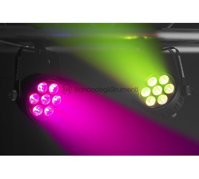 Light source: 7-in-1 LED LED colours: Red, Green, Blue, Amber, Ultra Violet, Cool White, Warm White LED power: 14 Quantity of LEDs: 7 Beam angle: 20 Field angle: 37 Illuminance: 7200 lx @ 1m Flash rate per second: 0 - 20Hz DMX channels: 3, 5, 7, 12 DMX connector: 3-pin XLR Modes: Automatic programs, DMX, Master/Slave Power plug: Power-connector Power consumption: 0.6 - 0.3A Power supply: 100-240VAC 50/60Hz Dimensions (L x W x H): 175 x 235 x 90mm Weight: 2,40 Accessories: Mounting bracket, Power cable