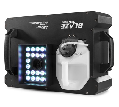 Macchina del fumo da 1800W con luci led 24x 4W 4-in-1 integrate Miscelazione di colore rosso, verde, blu e ambra Uso verticale o orizzontale Crea un'alta colonna di fumo illuminata Serbatoio illuminato a led (colore blu) Pannello di controllo integrato con display LCD Telecomando LCD con funzione timer (5mtr) Telecomando wireless integratomodalità DMX o standalone Serbatoio del fluido da 2800 mlIngresso Powerconnector